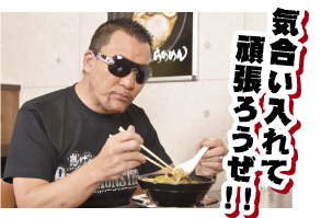 花月嵐ファンのみんな、久しぶりだな!蝶野正洋だ。2016年一発目の花月嵐の期間限定ラーメン『ブラックモンスター』の登場ということで、再びオレも参戦することになった。ついつい、この季節は寒さに凍えて気合いと元気が出せずに逃げ腰になる時があるかもしれない。そんな時こそ花月嵐に行って『ブラックモンスター』をガツンと食ってみてくれ!味もさることながら、不思議と心に熱い力が湧いて来るラーメンだ。今回で『ブラックモンスター』とは3度目のタッグだが、つくづく頼もしいオレの相棒だ。さあ、この冬はみんなで『ブラックモンスター』を食べて寒さをぶっ飛ばそうぜ!!