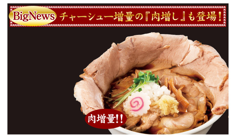 一面を覆うほどの肉のインパクトが『肉そばけいすけ』の特徴ですが、肉好きには更に嬉しくなるニュースです!! 大幅に肉のボリュームを増量した『肉そばけいすけ 肉増し』も同時発売予定です。ラーメンの具材として頬張る以外にも、別に注文したライスにのせて、自分だけのオリジナル丼を楽しむのもオススメです。 是非この機会にお召し上がりください。