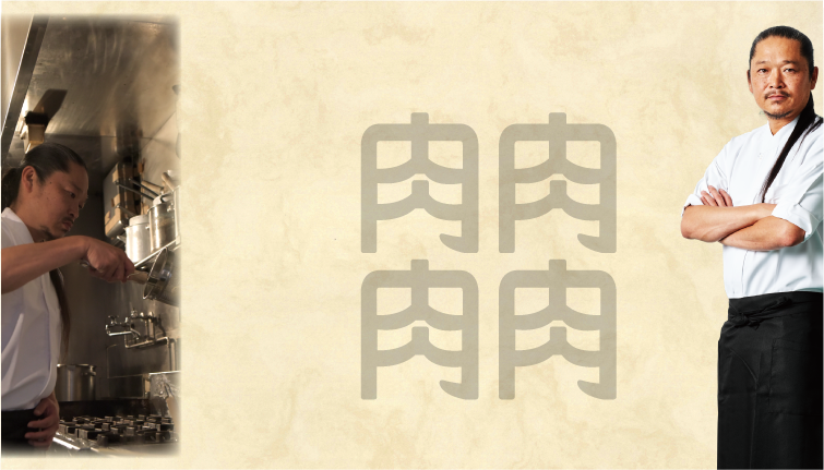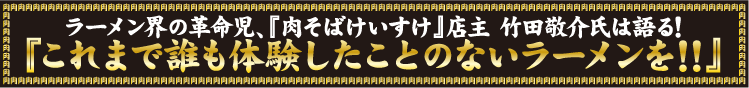 ラーメンの世界に足を踏み入れるまで、様々な食のジャンルにチャレンジしてきた竹田敬介氏。2005年に黒味噌を用いるという斬新な技法でラーメン業界に華々しくデビューを飾った。その後も、海老、トマトなど、ラーメンの常識の枠をはみ出た食材に着目し、誰も成し遂げてこなかったラーメンを創作してきた。『誰も体験したことのないようなラーメンを作りたいと常々思っているんです。そのため、全ての食の世界にアンテナを張って、面白い食材をいつも探してるんです。実は『肉そば』もその試みの一つで、普通はラーメンがあって、チャーシュー増しのチャーシューメンがある。だったら、基本のラーメンで、チャーシューメンのようにお肉の醍醐味が味わえるものがあっても良い、そう考えてアプローチしました。』近年、外国人観光客が激増する東京銀座では『フグ』や『鴨』を用いたラーメンを提供するなど、日本のみならず、世界の人々を驚かせる、ラーメン界の革命児、竹田氏の歩みは決して留まることがない!!