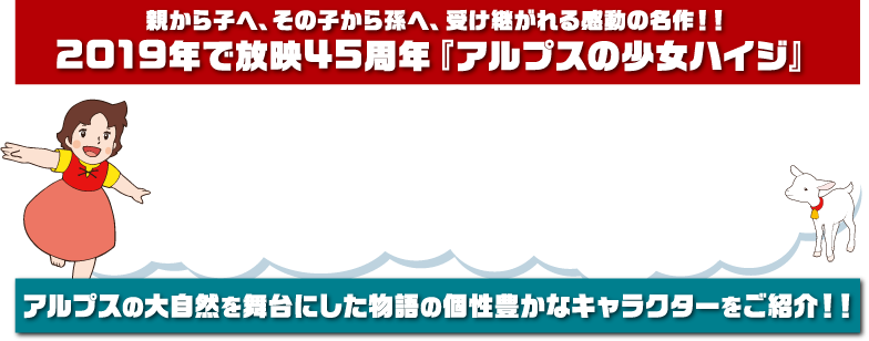 今なお多くの人達の心に影響を与え続ける感動の名作『アルプスの少女ハイジ』が2019年にテレビ放映から45周年を迎えます。スイスの大自然を舞台に主人公ハイジをはじめとする、個性的なキャラクター達が紡ぎだす、心温まる物語が当時大きな反響を呼びました。劇場版として公開もされ、また初放映以降も何回も再放送されてきたので、きっと多くの方々の心に優しさを灯し続けてきたことでしょう。