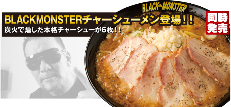 今回の登場にあたり、導入された備長炭を用いて職人の腕により丁寧に作られる人気の本格燻しチャーシュー。じっくりとスモークされたその香ばしさが格別の旨さ!!そのチャーシューを6枚盛り付けたブラックモンスターチャーシューメンも同時発売!!是非、お召し上がり下さい!!
