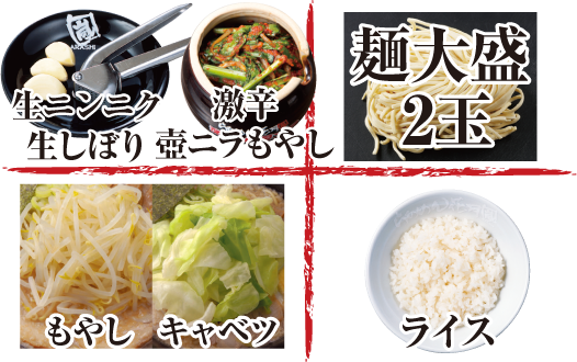 ガッツリ食べたいアナタには、まずはボリューム倍増の『麺大盛り』がオススメ!またライスを注文してスープの味が染みた野菜をおかずに食べるのもありだ!!更にトッピングのもやしとキャベツを追加してシャキシャキヘルシーバージョンにしたり、生ニンニク生しぼりや激辛壺ニラもやしを足して超デンジャラスにする作戦もあり!!是非あなただけの、こだわりの『ブラックモンスター』を作り上げてみよう!!