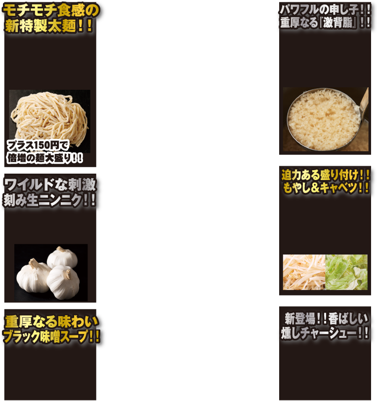 モチモチ食感のオリジナル新特製太麺。これまでとは違ったブラックモンスタースープとの相性をご堪能あれ!!