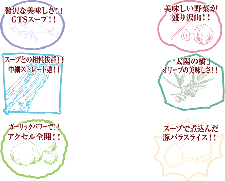 GTSスープと相性抜群の中細ストレート麺。味わい深いスープをしっかり引き立てつつ、具材たちとも優しく絡み、ラーメンとしての完成度を力強く支える立役者!!