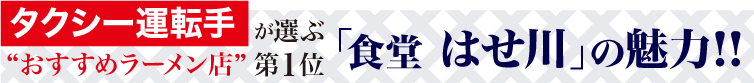 日本屈指のラーメンのまち「喜多方」で、高い評価を受けるラーメン店 「はせ川」。その味を生み出しているのは「ご当地ラーメンブーム」を幼い頃に体験し、初代店主のお店を20歳で受け継いだ2代目店主・長谷川大輔氏。醤油、味噌、塩、つけ麺、まぜ麺、今や世界食となって進化を遂げるラーメンの概念を全力で取り入れ、日々「新たなチャレンジ」を続けている。 タクシー運転手が選ぶ“おすすめラーメン店”第1位にも選ばれるなど、地元の人たちにも深く愛されている。