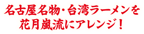 花月嵐自慢の中太麺に、スタミナ感たっぷりの具材をトッピング。 豚ひき肉を醤油・オイスターソース・唐辛子・ニンニクで炒めた、 旨味と辛さのバランスが絶妙な“台湾風そぼろ”こと「台湾ミンチ」を中心に、ニラ・ネギ・チリパウダーが加わり、香ばしさと刺激が一体となった、クセになる一杯です。