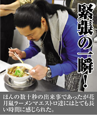 スープを一口すすりそして麺、肉を口にした竹田氏は満面の笑みで口を開いた。『本当にうちの肉そばだよ、これ…うまい!!本当、これうまい!肉の旨みが感じられる!もしかしたら、うちよりうまいかも(笑)。花月嵐さんは前からすごいと思っていたけど、また今回も驚かされました。私の作り出した肉そばが、日本全国のらあめん花月嵐さんで食べられるなんて、本当に嬉しいです!』