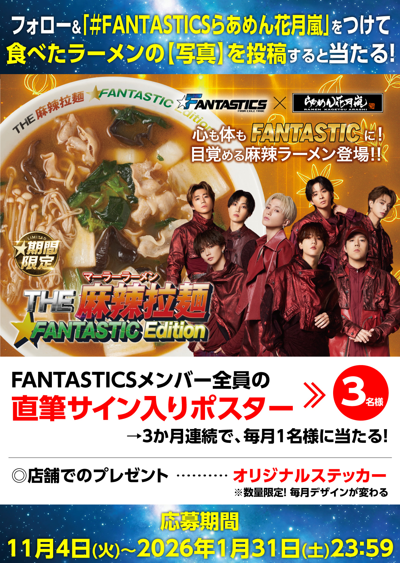 『#FANTASTICSらあめん花月嵐』を付けて、撮影した写真を投稿してください。