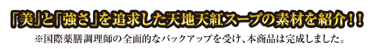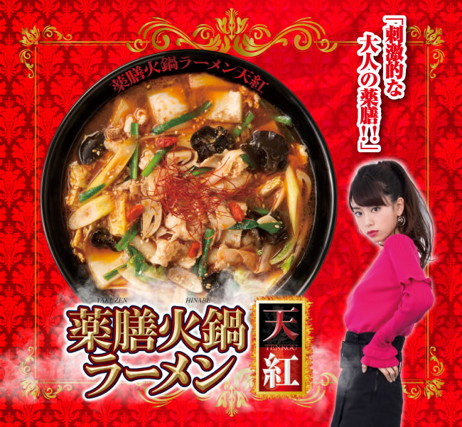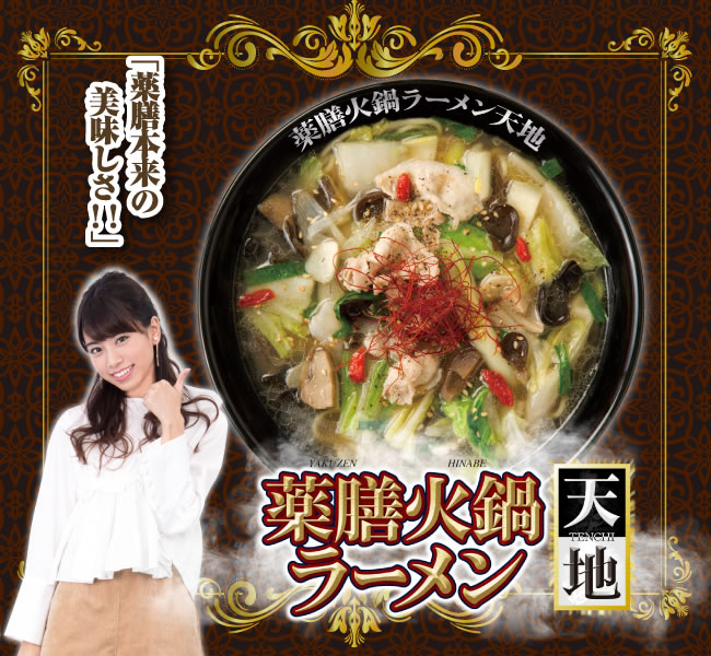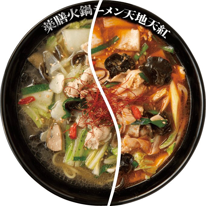 薬膳の本来の美味しさをしっかりと楽しみたい方には『薬膳火鍋ラーメン天地』、また刺激的な味わいがお好みの方には『薬膳火鍋ラーメン天紅』がオススメです。共にベースとなるスープは同じで数種類の香辛料が溶け出した滋味豊富な味わいが特徴です。また袋ダケやクコの実、そして定番の鍋の具材が盛り付けてあり、スープが染みたそれぞれの食材の味をお楽しみ頂けます。