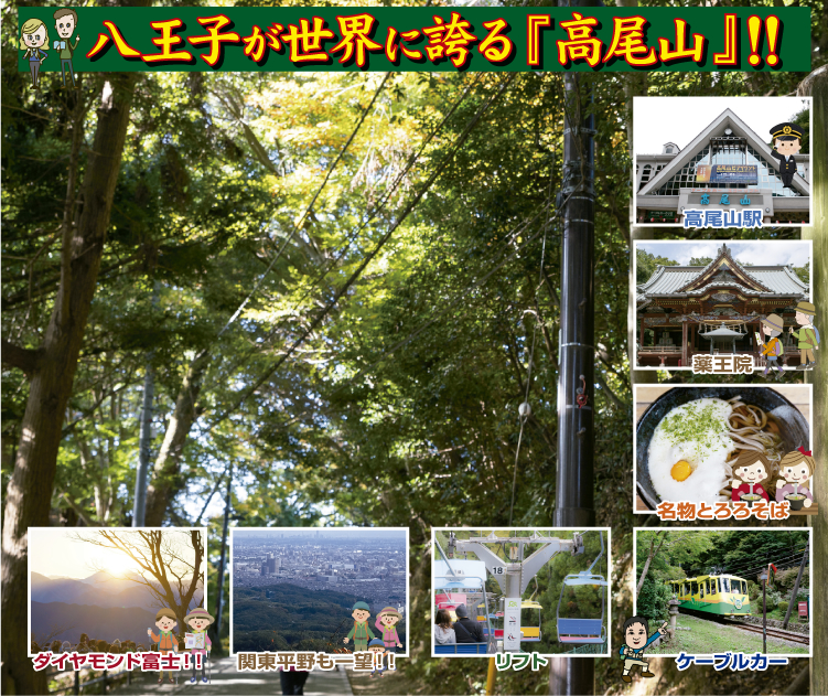 2007年にミシュランガイド最高ランクの『三ツ星』観光地に選出されて、海外の人達にも知れ渡るようになった八王子市を代表する観光地でもある『高尾山』。都心から一時間程でアクセス出来る利便性や、ケーブルカーを使えば初心者でも気軽に登山を楽しめます。年間260万人以上が訪れ、何と、その数は世界一の登山者数とされています。テレビ番組でも特集が組まれ、国内外の有名人も多数訪れているそうです。 天気の良い日には山頂から、東には関東平野が、西には富士山が一望でき、特に冬至の頃には富士山の山頂に夕日が沈む『ダイヤモンド富士』を望むことができる最高のスポットです。 また、あの元ビートルズのポール・マッカートニーも立ち寄ったという蕎麦屋もあり名物の『とろろそば』や『天狗焼き』などグルメも満喫でき、夏には東京一標高の高いビアガーデンもオープンしジョッキを片手に絶景の夜景が楽しめます。更に1,300種に及ぶ植物が生息する豊かな自然もあり、パワースポットもあり、温泉も出るということで、まさに魅力溢れる高尾山です!!