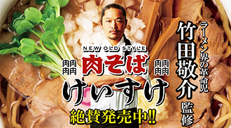 ラーメンの世界に足を踏み入れるまで、様々な食のジャンルにチャレンジしてきた竹田敬介氏。2005年に黒味噌を用いるという斬新な技法でラーメン業界に華々しくデビューを飾った。その後も、海老、トマトなど、ラーメンの常識の枠をはみ出た食材に着目し、誰も成し遂げてこなかったラーメンを創作してきた。『誰も体験したことのないようなラーメンを作りたいと常々思っているんです。そのため、全ての食の世界にアンテナを張って、面白い食材をいつも探してるんです。実は『肉そば』もその試みの一つで、普通はラーメンがあって、チャーシュー増しのチャーシューメンがある。だったら、基本のラーメンで、チャーシューメンのようにお肉の醍醐味が味わえるものがあっても良い、そう考えてアプローチしました。』近年、外国人観光客が激増する東京銀座では『フグ』や『鴨』を用いたラーメンを提供するなど、日本のみならず、世界の人々を驚かせる、ラーメン界の革命児、竹田氏の歩みは決して留まることがない!!