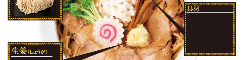 生姜のきいた甘醤油スープと見事に絡みあう粉の配合にこだわったウェーブのかかった中太麺を使用。