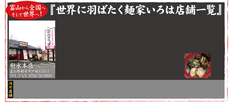 ・富山麺家 上海SOHO店・富山麺家 上海Crystal店(静安寺店)・上海虹橋店・富山麺家 上海虹口店・上海5号店 ・一好拉面 武漢店・一好拉面 武漢IKEA店・一好拉面 武漢CAPITAL店・富山麺家 西安曲江金鷹店・泰州万逹店 ・重慶店・富山麺家 香港店・新竹店・台北店・タイ トンロー店・タイ オンヌット店・ベトナム ハノイ店
