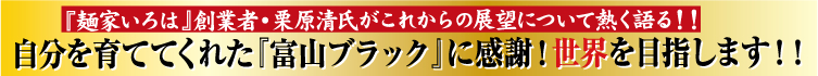 昔は無名だった『富山ブラック』の名が、短期間で皆さんに知っていただけたというのは、担い手として、こんなに嬉しいことはないですよね。 実はこんなエピソードがありました。初めて会った人に『栗原さんは富山出身なんですか。富山県と言えば、富山ブラックってラーメンが有名ですよね?ご存知ですか?』 と言われた時は、本当に嬉しい気持ちになりましたね。『頑張ったな、俺もここまで・・・』って、あの時は、ちょっと自分を誉めてあげたいと思いました。 今は、『富山ブラック』の名前もかなり国内に浸透して、『麺家いろは』もアジア各国に出店し、海外のお客様にも喜んでいただけるようになりました。 ただ、私の夢はまだまだ終わりません。世界は広いですから。もっと、もっと、自分をここまで育ててくれた『富山ブラック』への恩返しじゃないですが、できることを探していきたいと思っています。