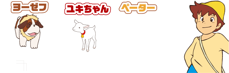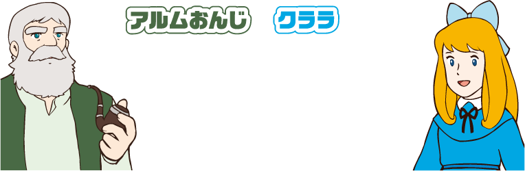 元気いっぱいで素直な女の子。幼い頃にお父さんとお母さんを亡くし、祖父アルムおんじと一緒に山小屋で暮らしています。スイス・アルプスの豊かな自然に囲まれ、様々な人との関わりの中ですくすくと成長していきます。