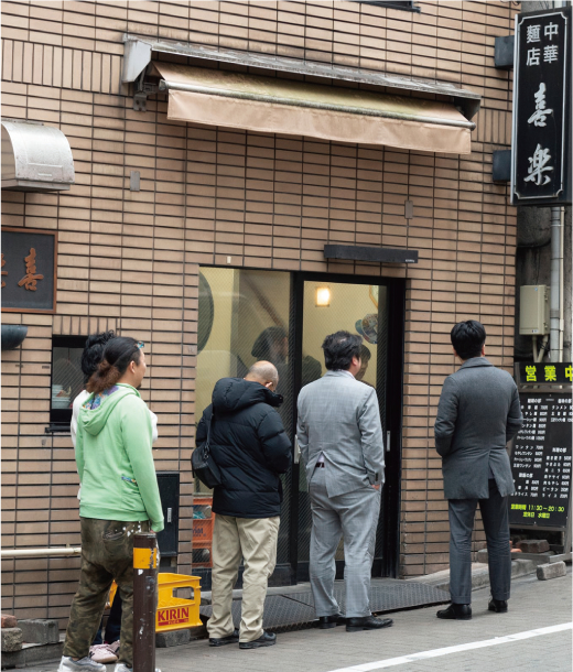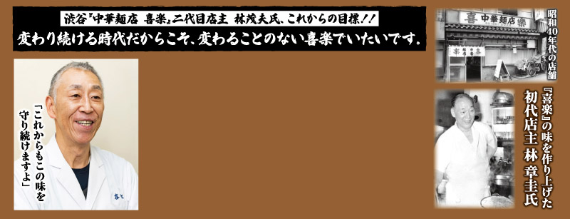 今回、花月嵐の『中華麺 喜楽』監修の渋谷の老舗『喜楽』を紹介しよう。創業は昭和27年(1952年)。初代店主が渋谷の道玄坂から一本入った現在の地に創業をしてから半世紀以上の間、変わり続ける渋谷という街で、変わらぬ味を作り続ける、もはや東京を代表する老舗中の老舗である。現在は、二代目店主、林茂夫氏に引き継がれファンを魅了し続けており、そして三代目の章太朗さんも厨房に立ち、『喜楽』のこれからの新しい歴史を日々築き上げている。常に新しい食文化が発信され、入れ替わりの激しい渋谷で、これだけの長い間、愛され続けているのはきっと『喜楽』ぐらいではなかろうか?