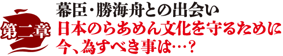 “日本のらあめん文化の行く末”に疑問を持つようになった龍馬は、海外の食文化に精通していると噂の幕府の役人、勝海舟に会うことになる。勝は、このままでは海外に日本のらあめん文化をめちゃくちゃにされてしまうこと、それを防ぐためには国内で争っている場合ではないと龍馬に説く。