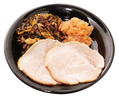 専用トッピング「博多盛り」 - 博多ラーメン香美を自分好みにカスタマイズしたい方におすすめのトッピング盛り合わせ、「博多盛り」! 辛子高菜・辛子明太子・チャーシューのセットで、辛子高菜は豚骨ラーメンにアクセントを加え、辛子明太子は博多の味わいを堪能できる味変アイテムです。