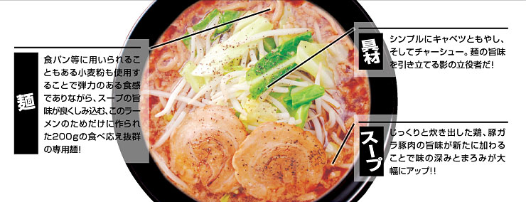 そこで、スープには鶏・豚ガラといった動物系の旨味を加え、炊き出しの時間を大幅に増やして深みとまろやかさを足し、さらにサツマイモやジャガイモを入れることでスープに厚みとコクを足しました。またタレは、特製の本醸造濃口醤油に野菜の甘味を足すことで、スープに負けない力強いタレへと進化しました。