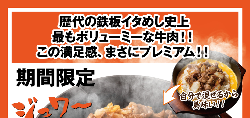 歴代の鉄板イタめし史上、最もボリューミーな牛肉!! この満足感、まさにプレミアム!!