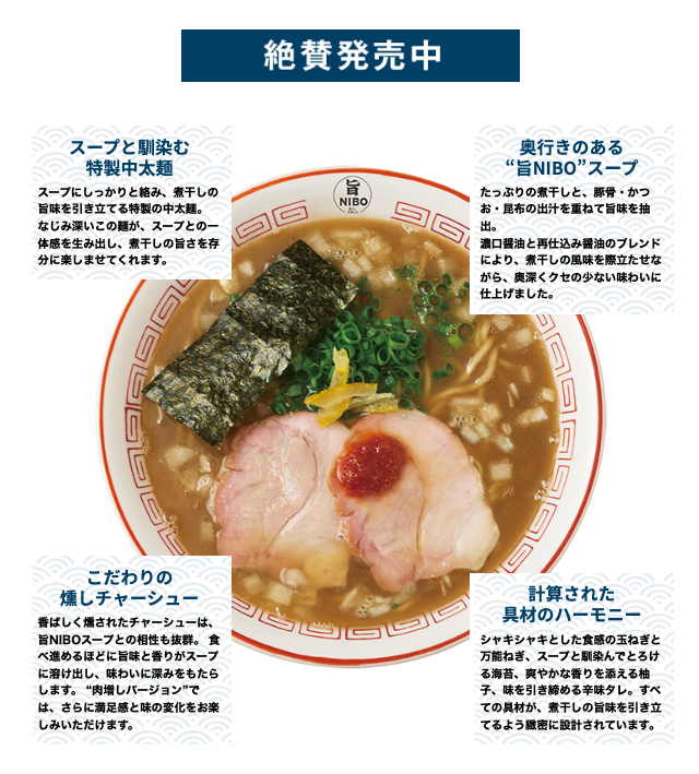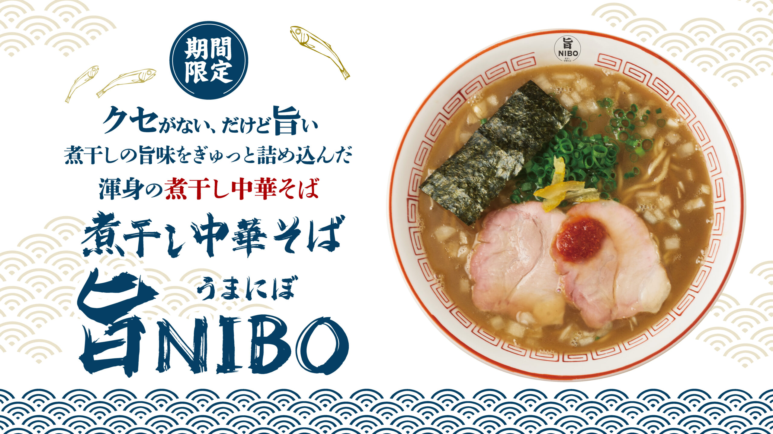 煮干しの旨味を,ぎゅっと詰め込んだ、じんわりとしみわたる一杯。『煮干し中華そば 旨NIBO』ただいま、絶賛発売中