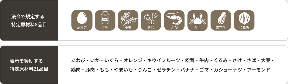 表示している「アレルギー物質」の項目は、食品衛生法にて表示が義務付けられている8品目と、アレルギーを引き起こす可能性のある食品で、それらが原材料に含まれている場合に表示が奨励されている21品目について表示しております。