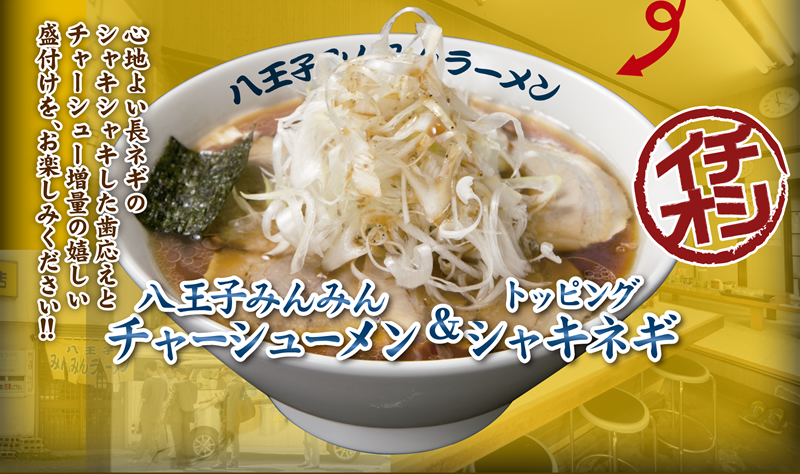本家『みんみんラーメン』での、オススメが豚バラチャーシューとネギの盛付けを追加した『ネギバラチャーシューメン』。多くのお客様が注文する大人気のメニューです。 そこで花月嵐でも、是非、そのワンランク上の満足感をご堪能頂けるよう、『八王子みんみんチャーシューメン』もご用意。そこに、トッピング『シャキネギ』を加えて一緒に是非ご注文してみてください!!